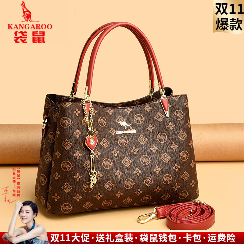 袋鼠卡拉品牌真皮包包女包2025新款大气送中年妈妈包轻奢气质手提包高级感 棕配红(送礼盒装+手包卡包+长肩带+吊坠) 大包(长30-厚13-高22厘米)