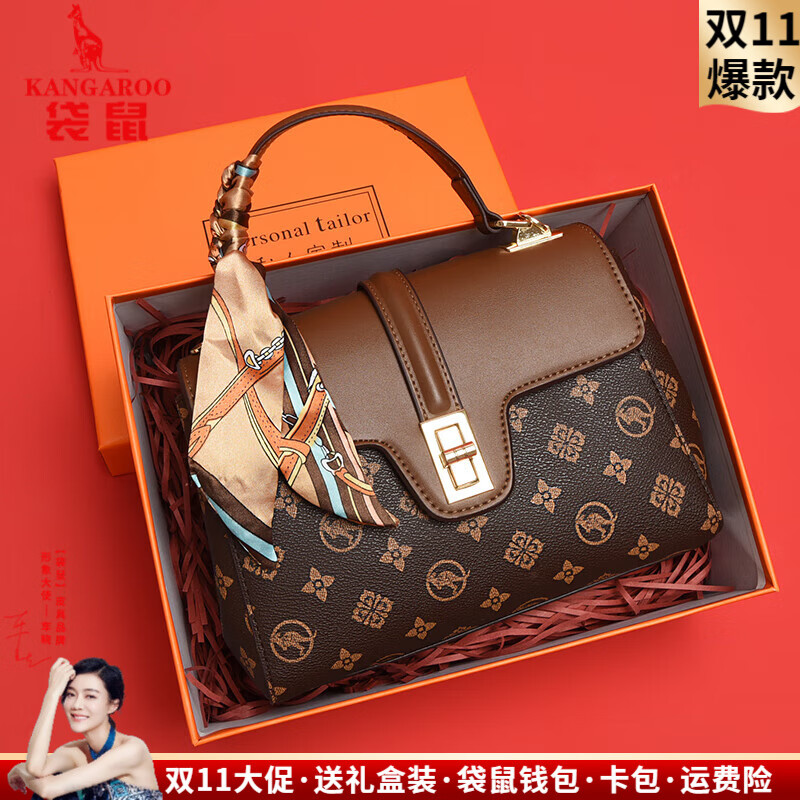 袋鼠卡拉母亲节送妈妈生日礼物轻奢真皮包包女包斜挎包单肩手提包洋气小包 棕配咖(礼盒礼袋+丝巾+长肩带) 小包(长23-厚11-高16厘米)