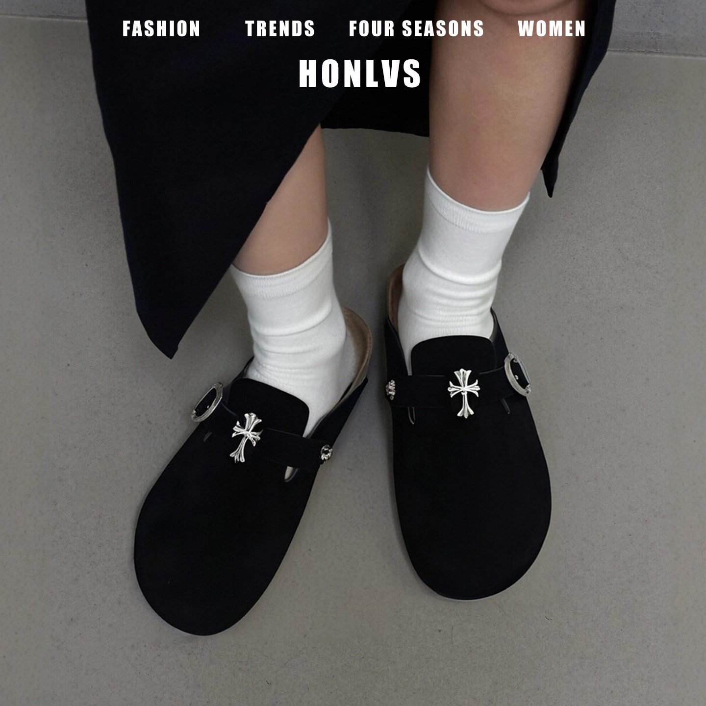 复古十字花黑色软木勃肯鞋厚底一脚蹬懒人真皮包头半拖鞋女夏外穿