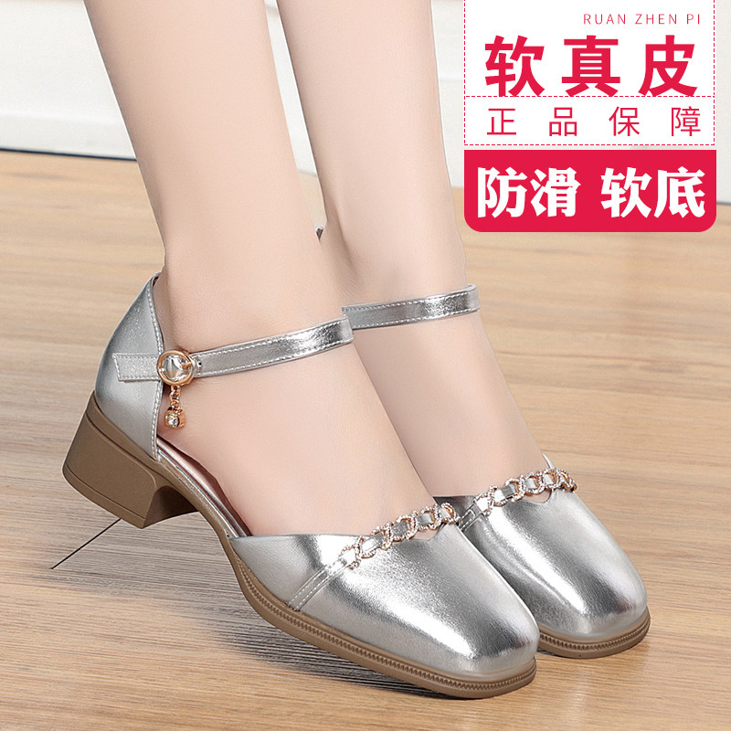 红青蜓真皮包头凉鞋女粗跟2024夏季新款一字扣带高跟鞋配裙子单鞋