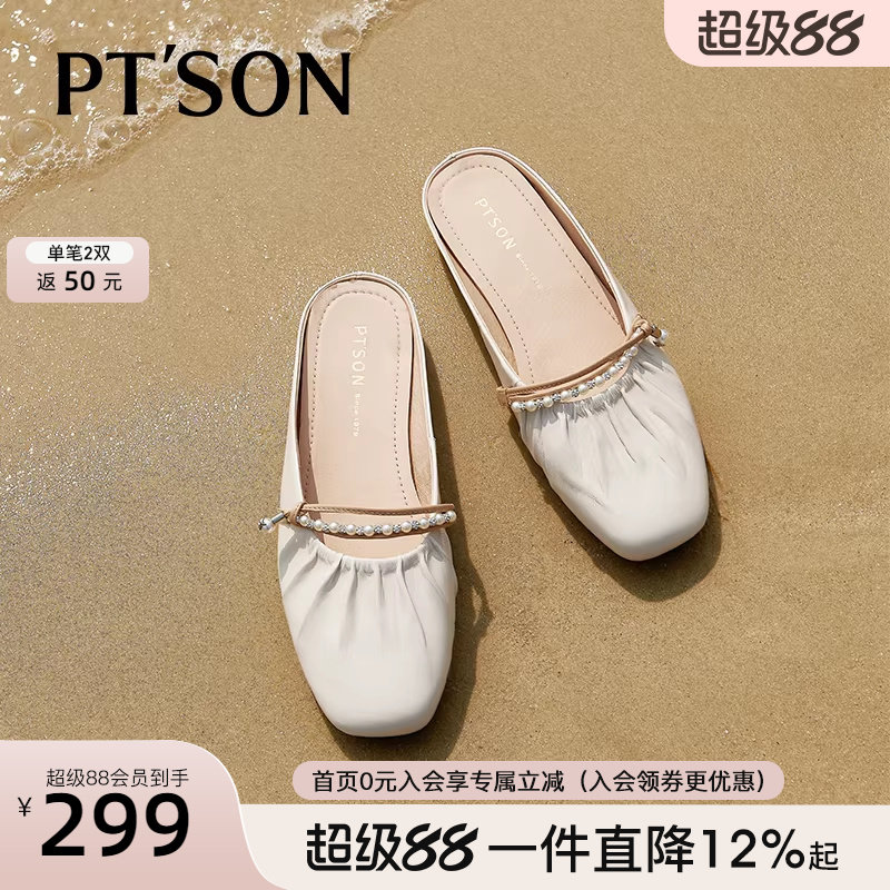 百田森舒软羊皮穆勒鞋女春夏新款真皮包头拖鞋褶皱水钻平底半拖鞋