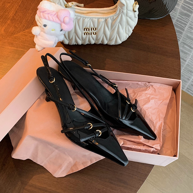 「卡鹿莉 KLULI」法式尖头高跟鞋女细跟后空皮带扣真皮包头凉拖鞋