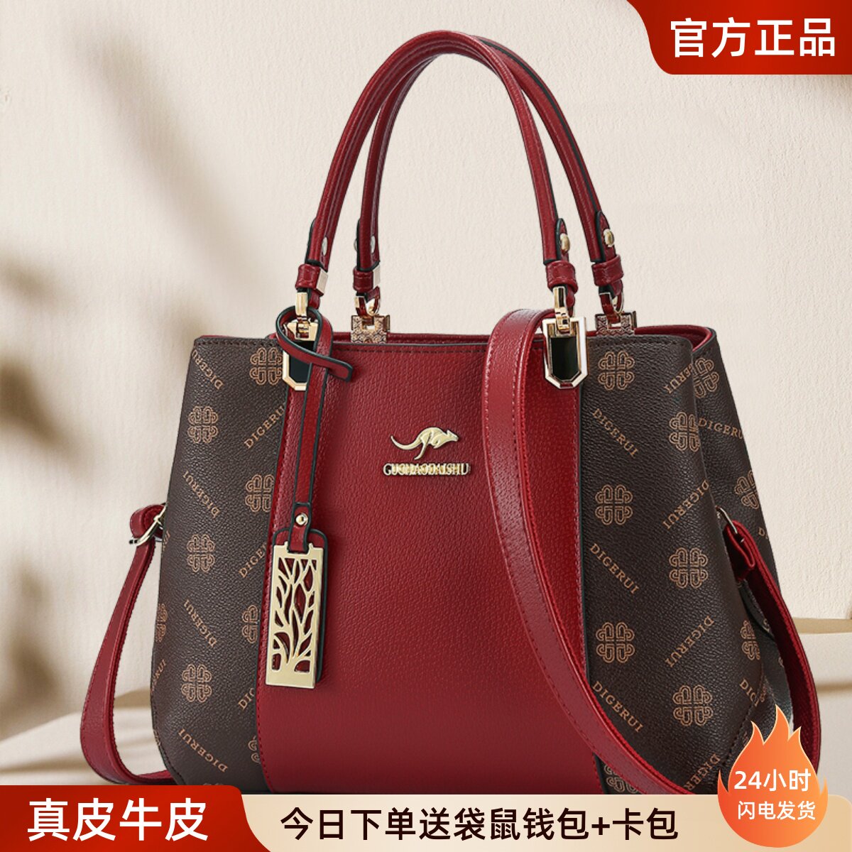 袋鼠时尚手提包女包包新款2025真皮牛皮包斜挎包中年妈妈包潮 酒红色