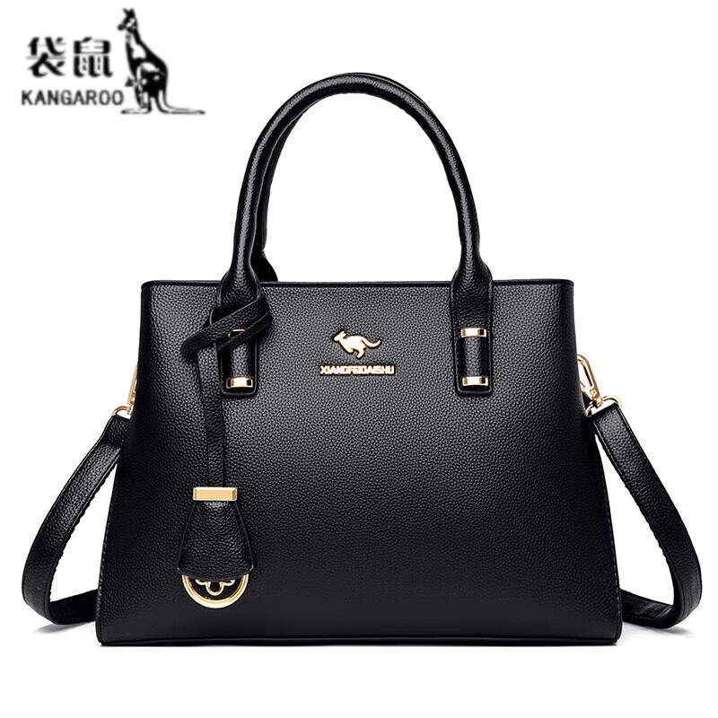 袋鼠(KANGAROO)真皮手提包女大容量2024中年女士妈妈女包百搭斜挎牛皮包 黑色 真皮授权