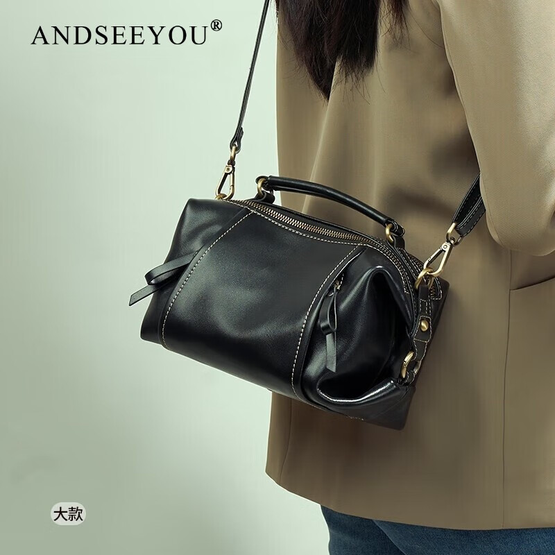 ANDSEEYOU真皮包包女2025新款时尚枕头包通勤手提包头层牛皮女士单肩斜挎包 黑色大号
