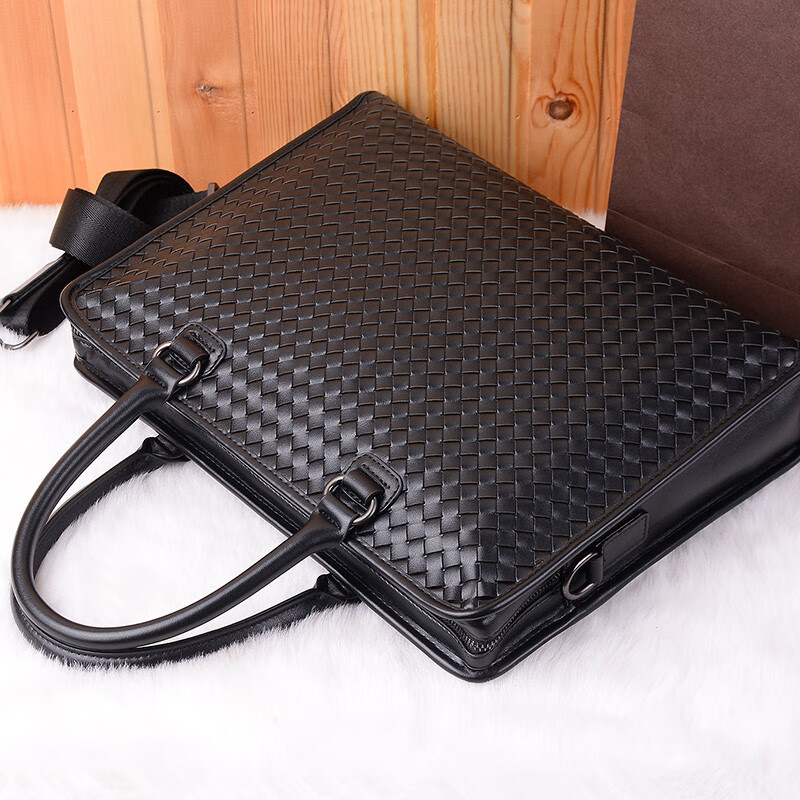 酷奇袋鼠(KUQIDAISHU)手提包男士公文包商务真皮包休闲单肩斜挎编织公务包 黑色 配送肩带