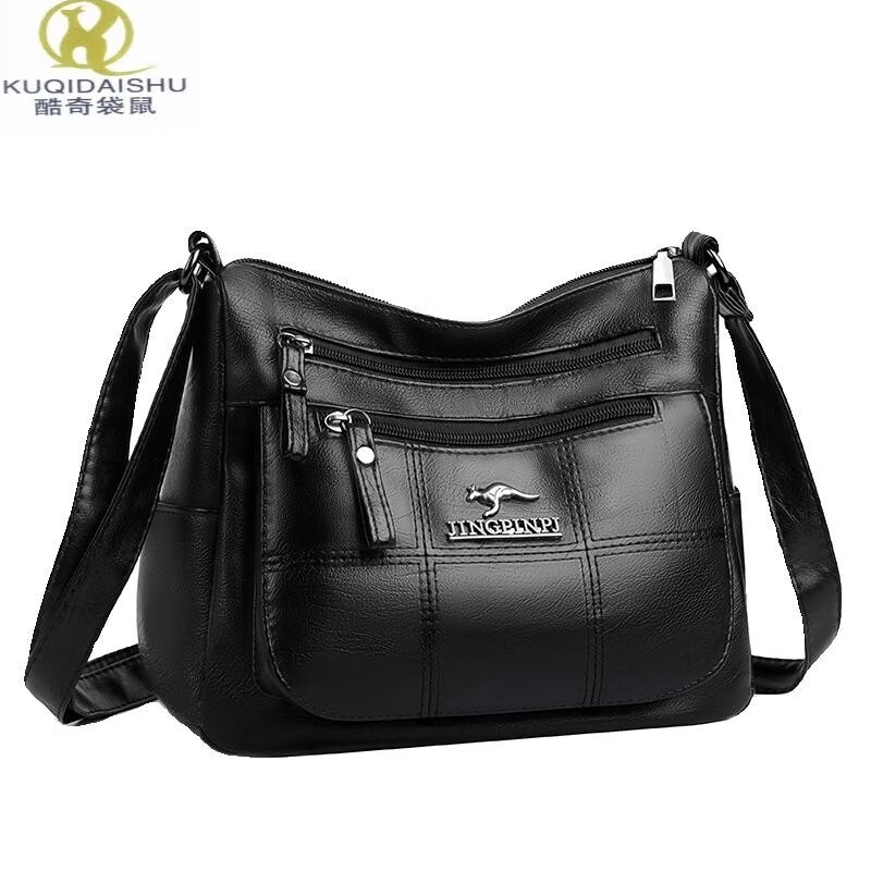 酷奇袋鼠(KUQIDAISHU)多层软皮包包女2024新款时尚百搭中老年妈妈包大容量单肩斜挎包女 黑色
