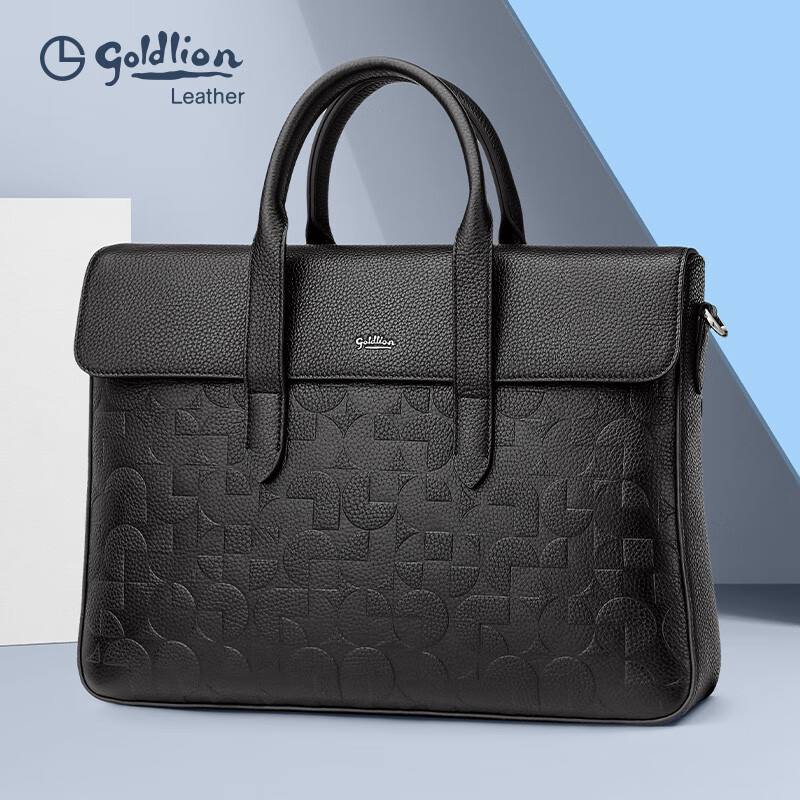 金利来(Goldlion)新款手提包男士轻奢真皮包盖式公文包压花头层牛皮商务男包 黑色 默认规格