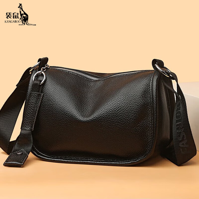 袋鼠真皮女包2025潮时尚百搭头层牛皮单肩斜挎包休闲大容量软皮包 黑色 真皮授权 收藏+手拿包