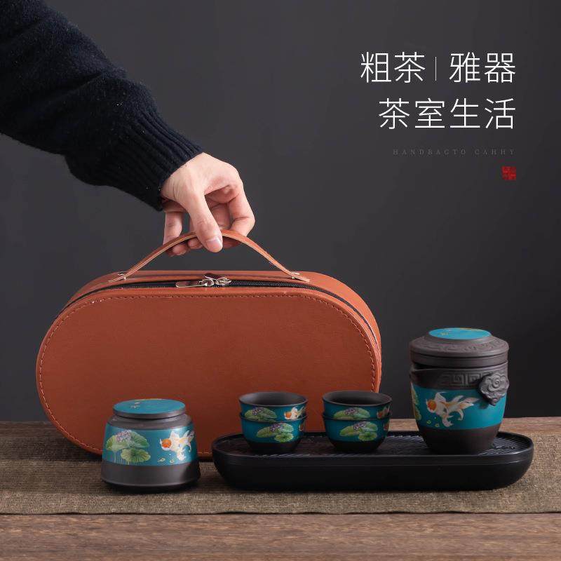 新款旅行茶具套装高档紫砂便携式皮包户外旅游泡茶快客杯一壶四杯