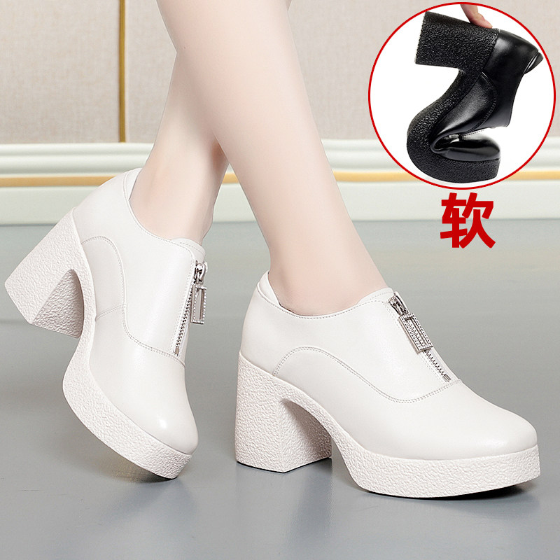 中年女士皮鞋真皮粗跟厚底白色高跟鞋不累脚女鞋软皮包脚面单鞋女