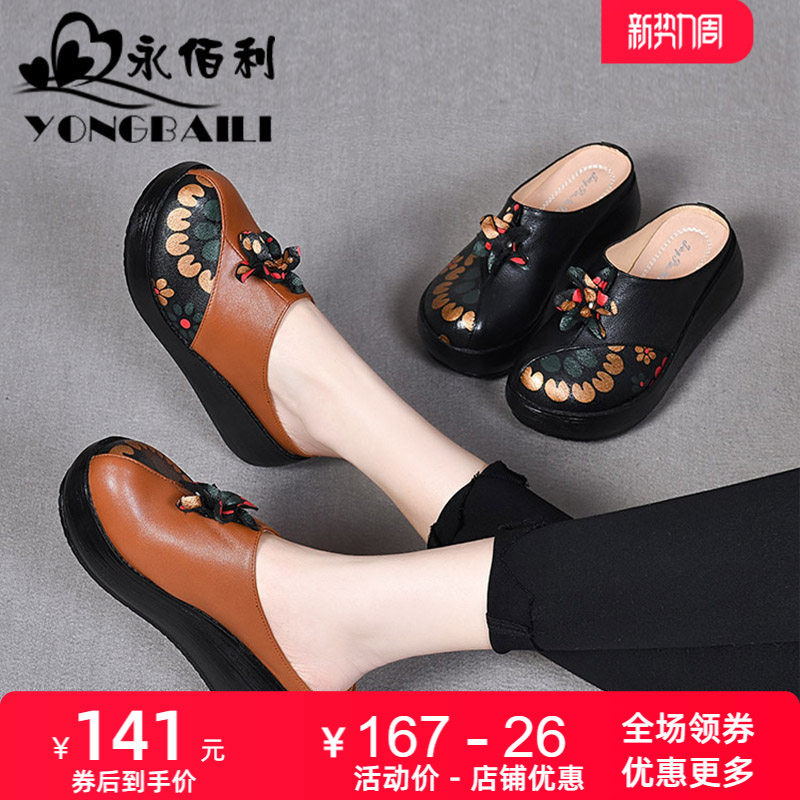 相伴真皮包头凉鞋女夏季休闲一字扣带厚底粗跟复古民族风妈妈鞋子