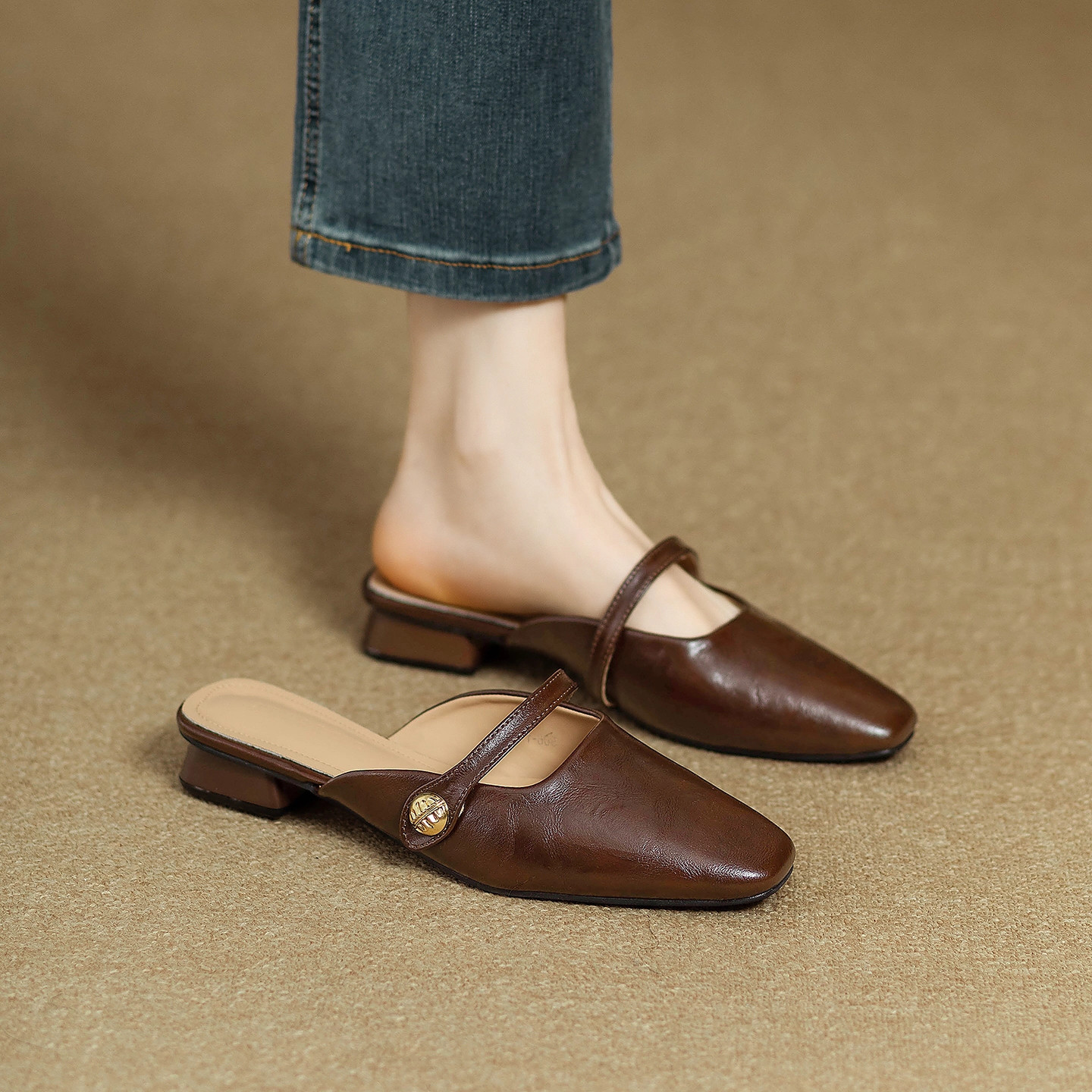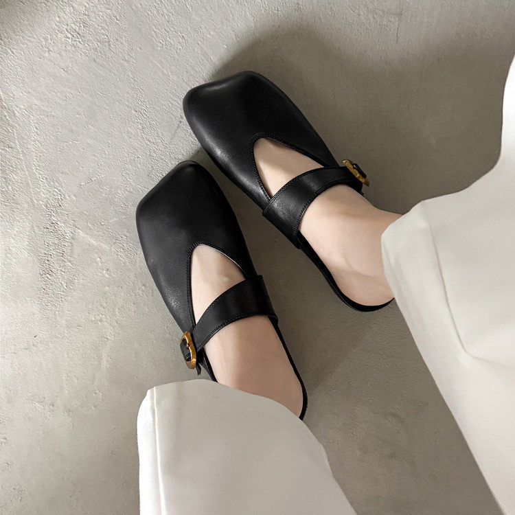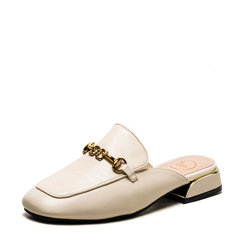 复古方头一字扣穆勒鞋苹果头凉鞋真皮包头拖低跟通勤外穿懒人凉拖