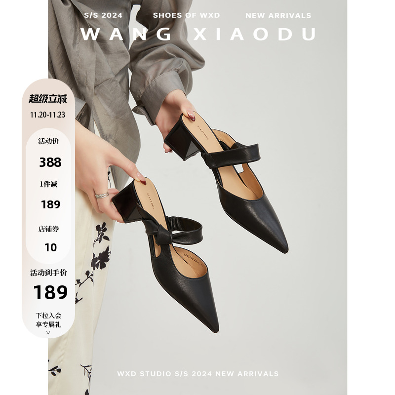 【王小毒】温柔印记○羊皮包尖头半拖鞋女夏外穿一字带粗跟穆勒鞋