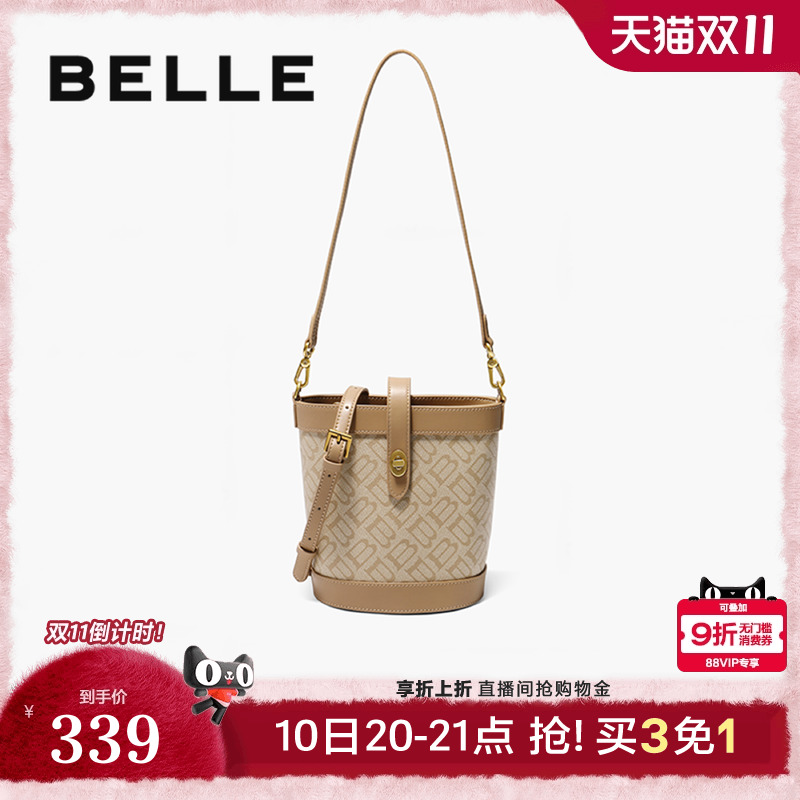 百丽反绒麂皮包包女2025新款老花通勤单肩斜挎手提水桶包JY216AX5