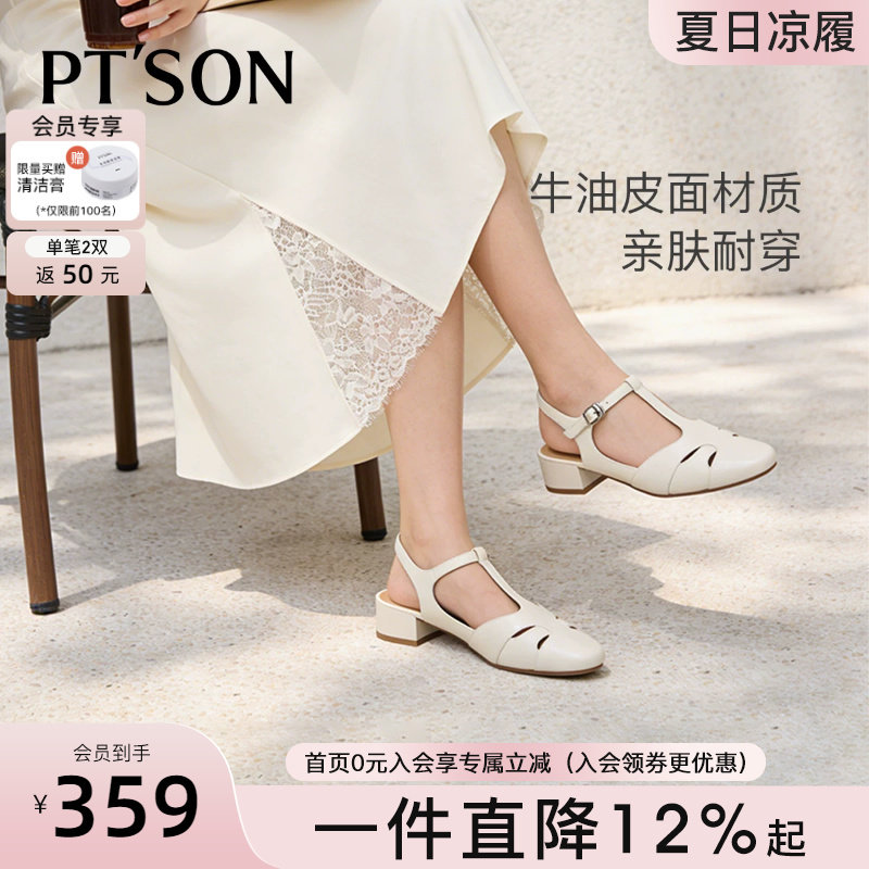 百田森2026新款真皮包头粗跟凉鞋女镂空夏季百搭一字带圆头女鞋