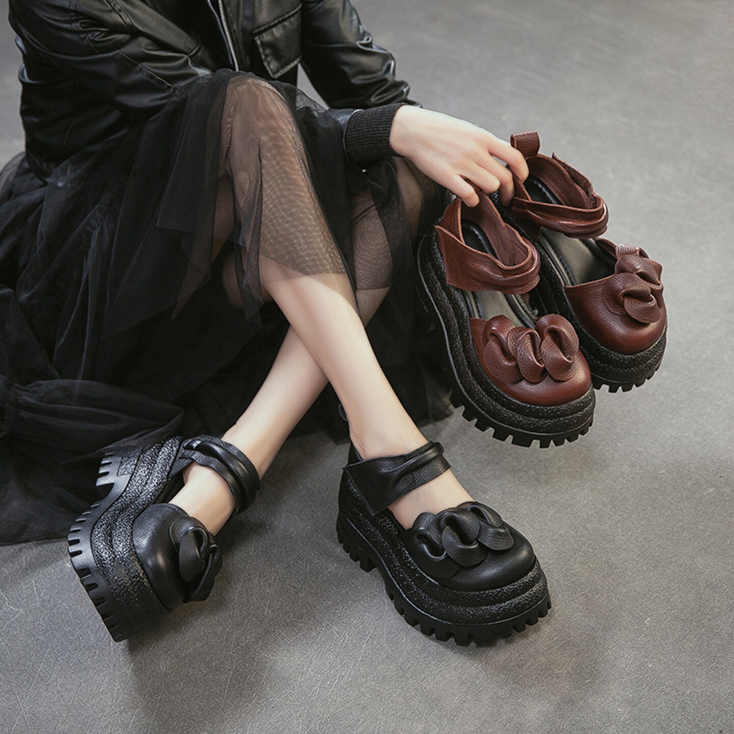 四月倾城复古风真皮包头松糕鞋女厚底花朵装饰休闲百搭增高凉鞋