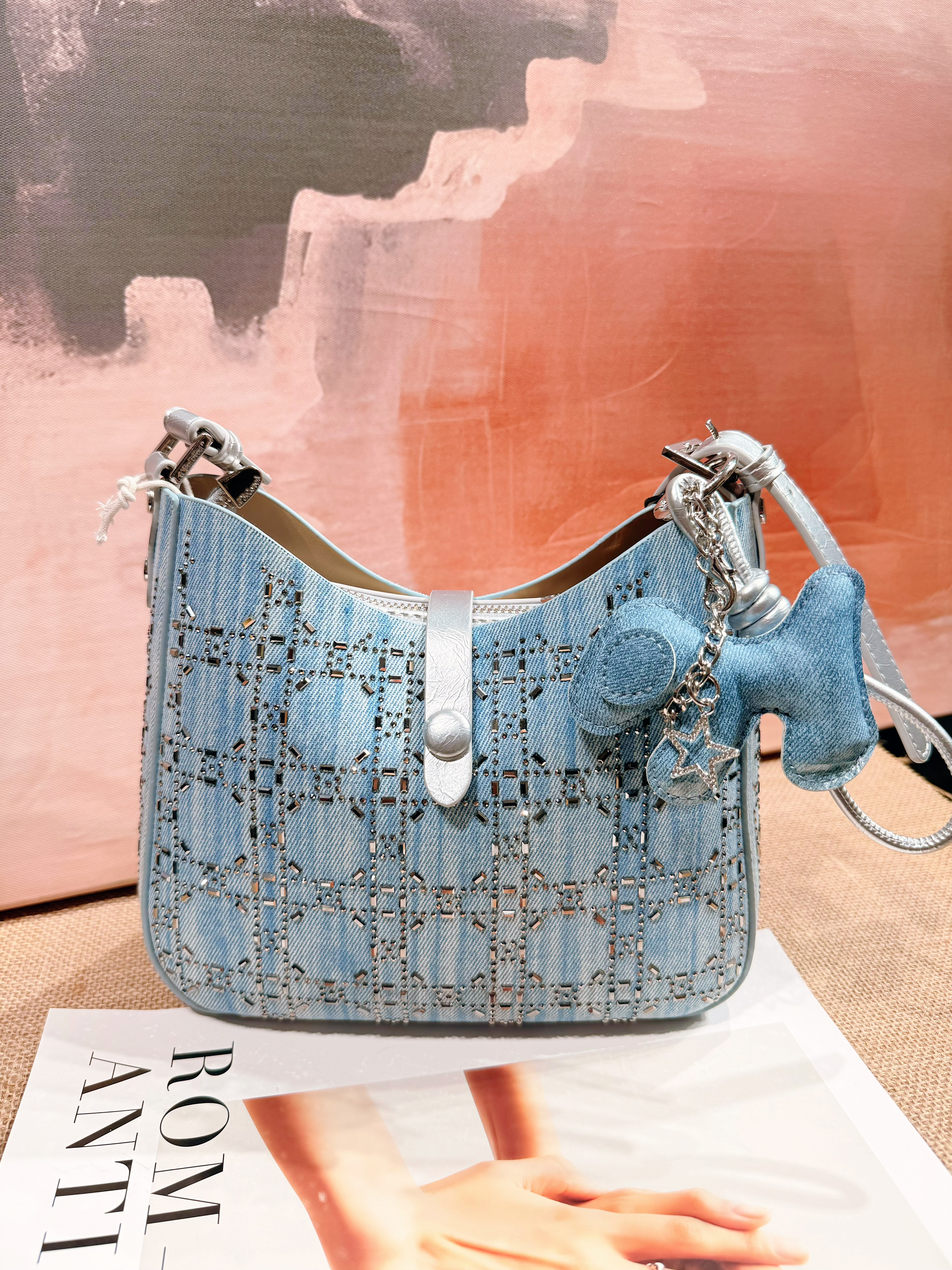 2026新款时尚手提百搭真皮烫钻牛仔布高级单肩斜挎通勤腋下女皮包