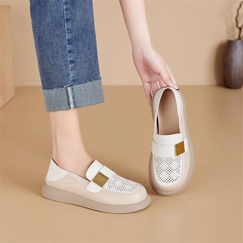 品牌鞋真皮包头凉鞋女乐福鞋2026年新款夏季镂空软底休闲洞洞单鞋