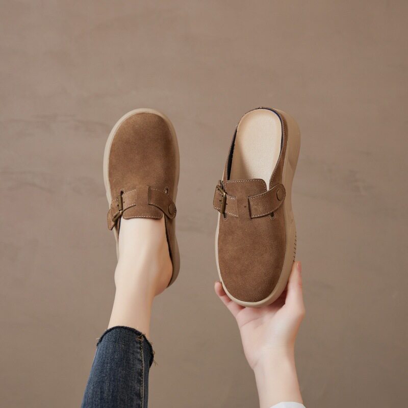 真皮包头厚底鞋女半拖鞋2026春夏新款复古松糕皮带扣室外凉拖鞋