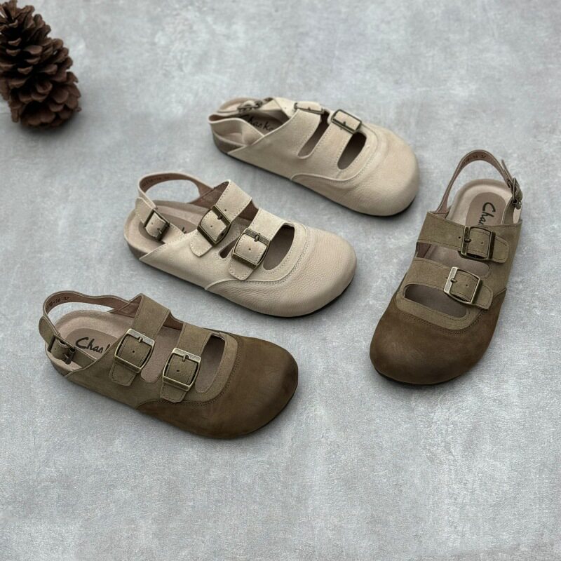 手作野牛皮拖鞋套脚水洗柔软真皮包头凉鞋手工缝制平底舒适居家款