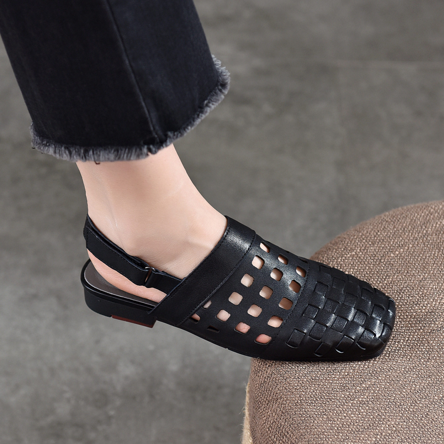 真皮包头后空低跟凉鞋编织镂空舒适通勤凉鞋牛皮优雅平底洞洞女鞋