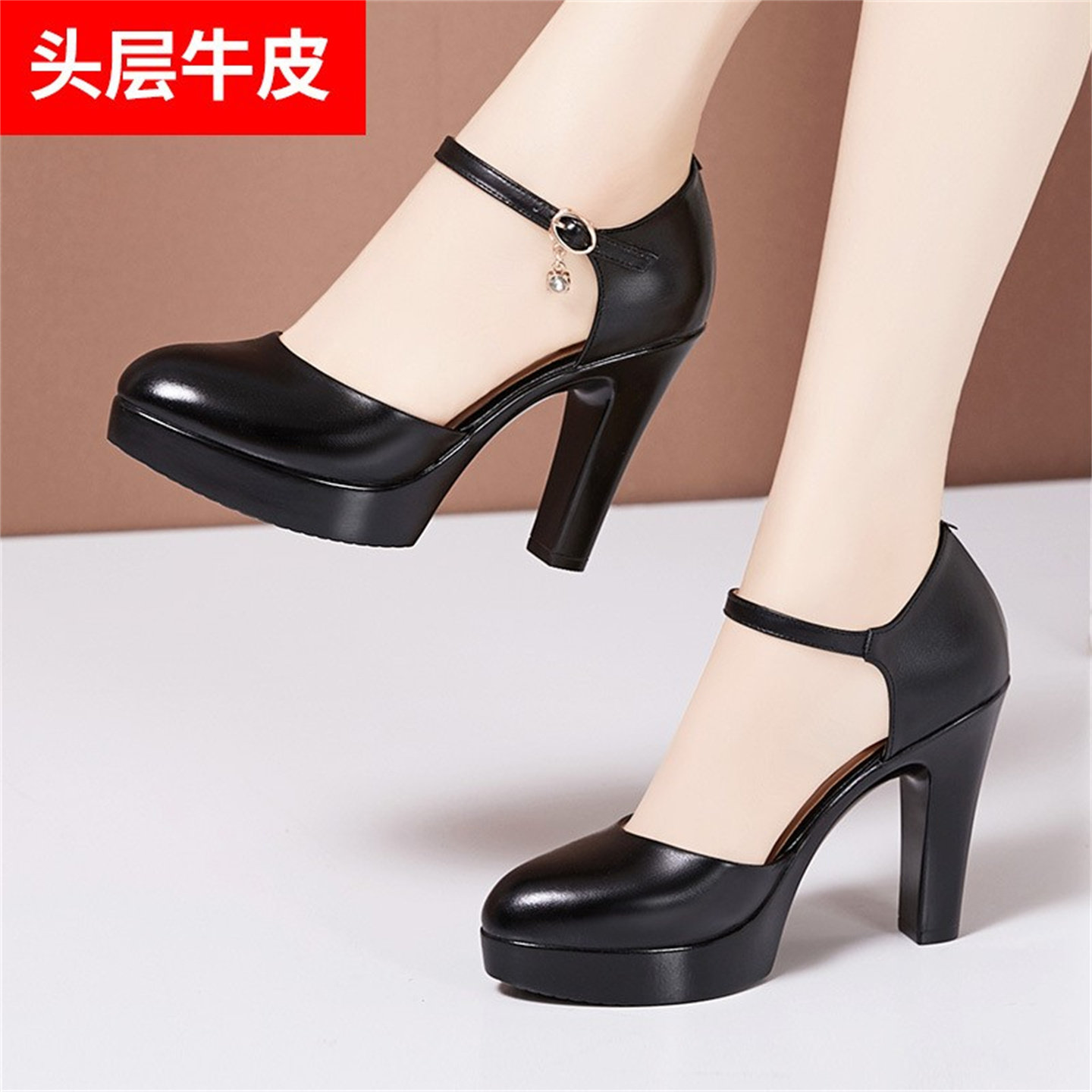 自由姿色真皮包头高跟凉鞋女春夏季新款细跟方扣半凉拖单鞋