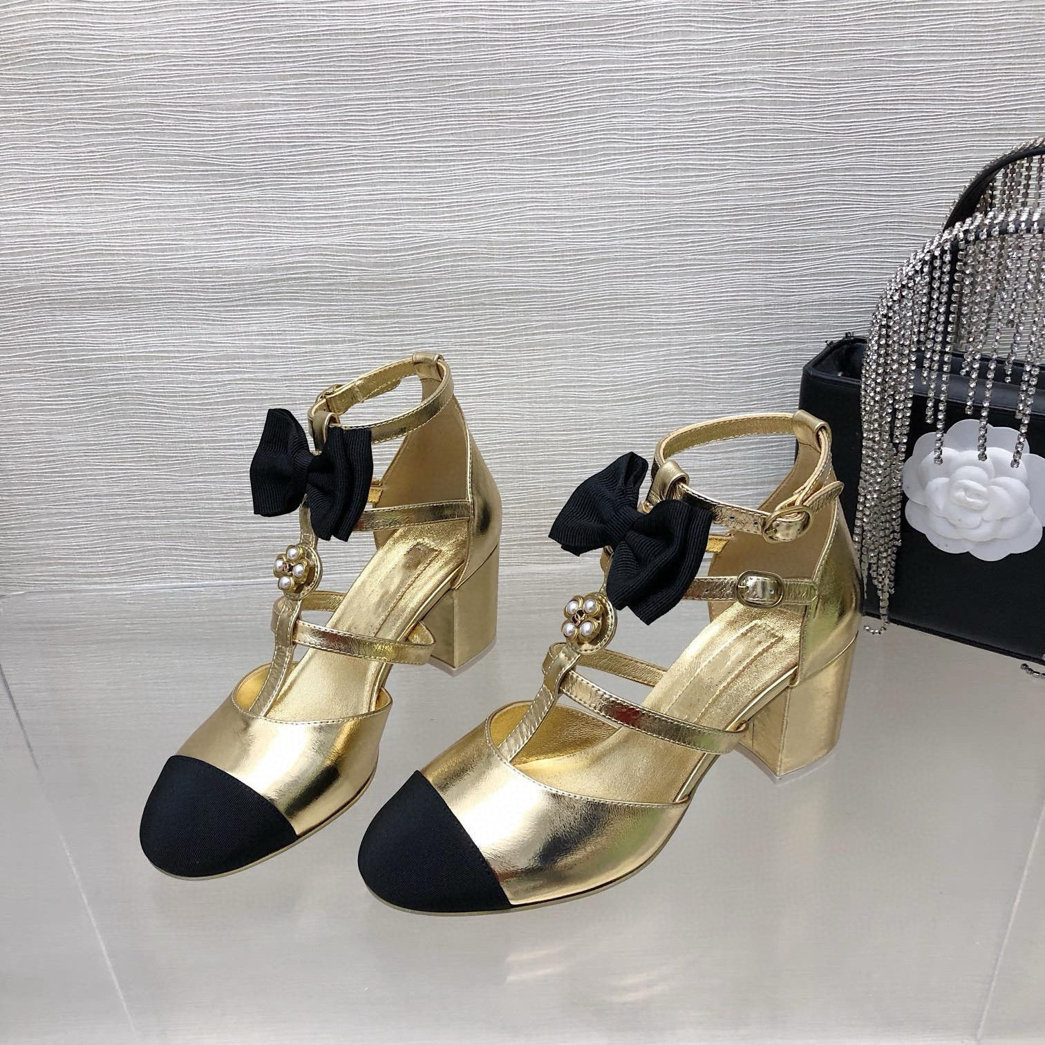 小香风金属花朵蝴蝶结包头凉鞋女24夏季真皮包跟粗跟高跟玛丽珍鞋