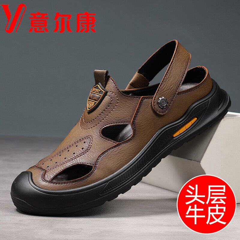 意尔康凉鞋男夏季男士真皮包头外穿休闲沙滩鞋防滑软底镂空拖鞋男