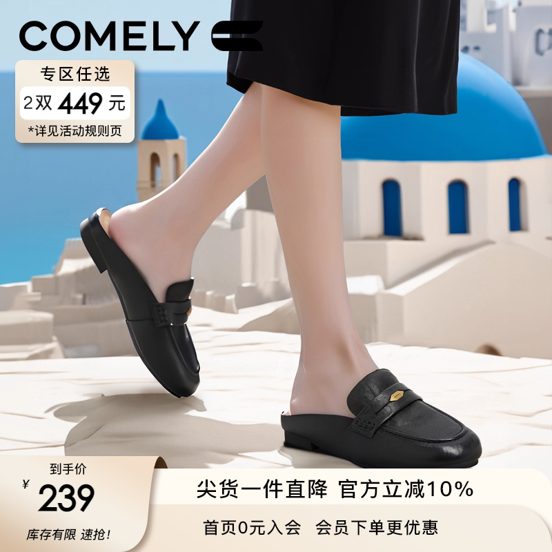 康莉真皮包头半拖鞋女25春夏新款圆头幸运金币扣乐福鞋低跟穆勒鞋