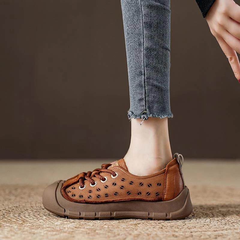 极速2026春夏新款真皮包头厚底洞洞鞋镂空凉鞋平跟复古鞋系带休闲