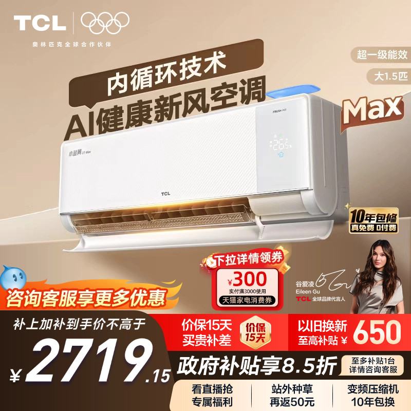【新品】TCL空调大1.5匹小蓝翼新风Max新一级冷暖变频家用挂机