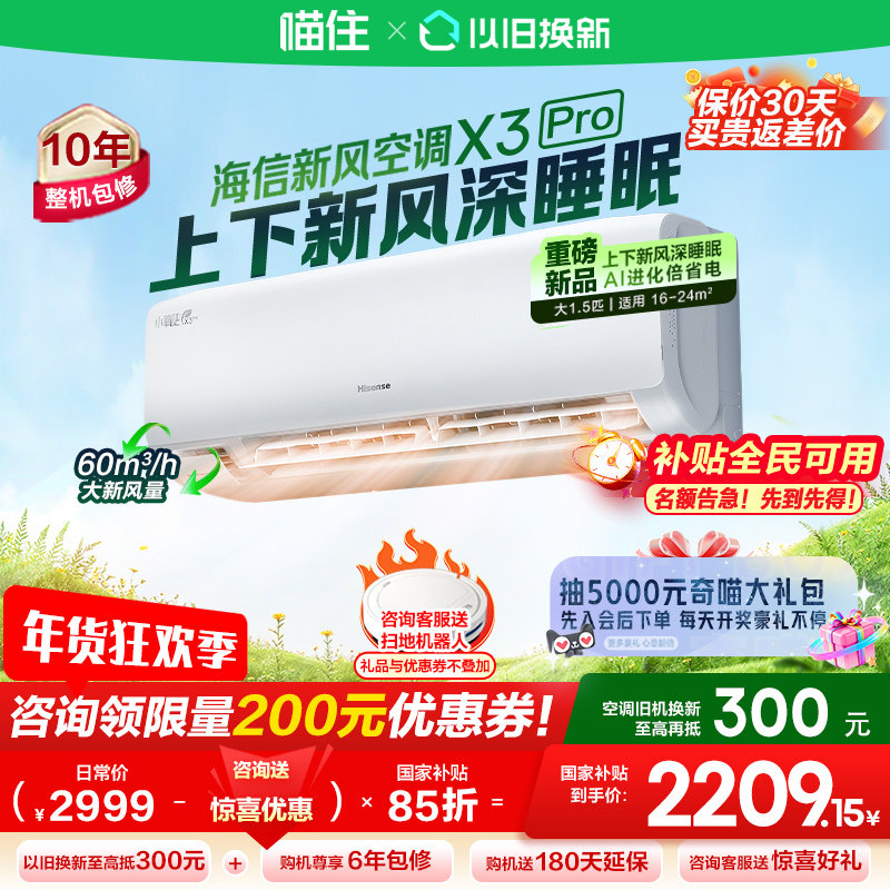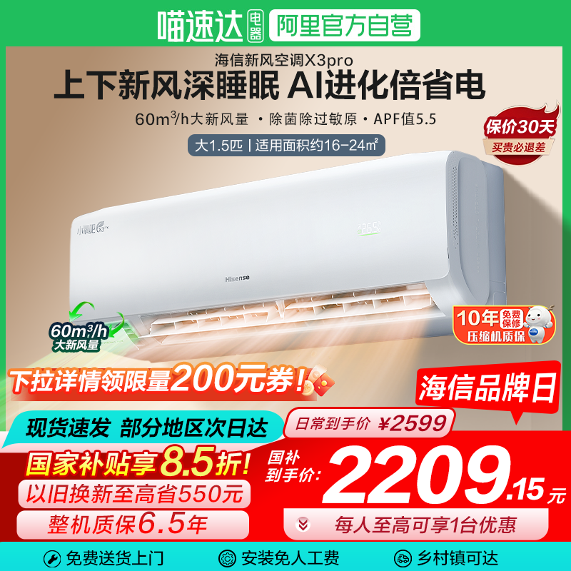 【海信新风空调X3Pro大1.5匹挂机一级能效家用以旧换新补贴629