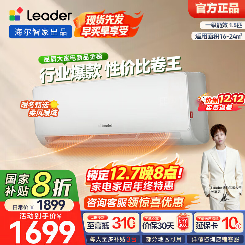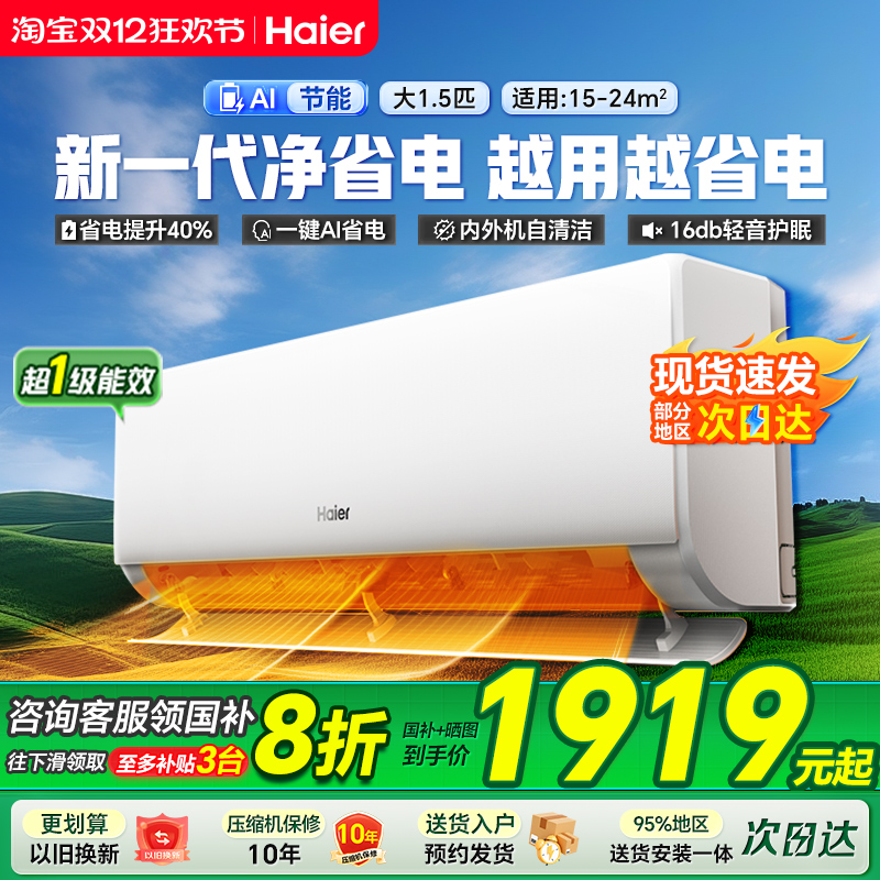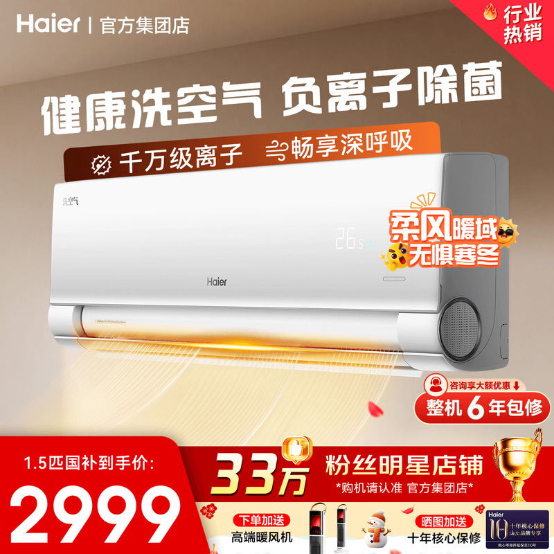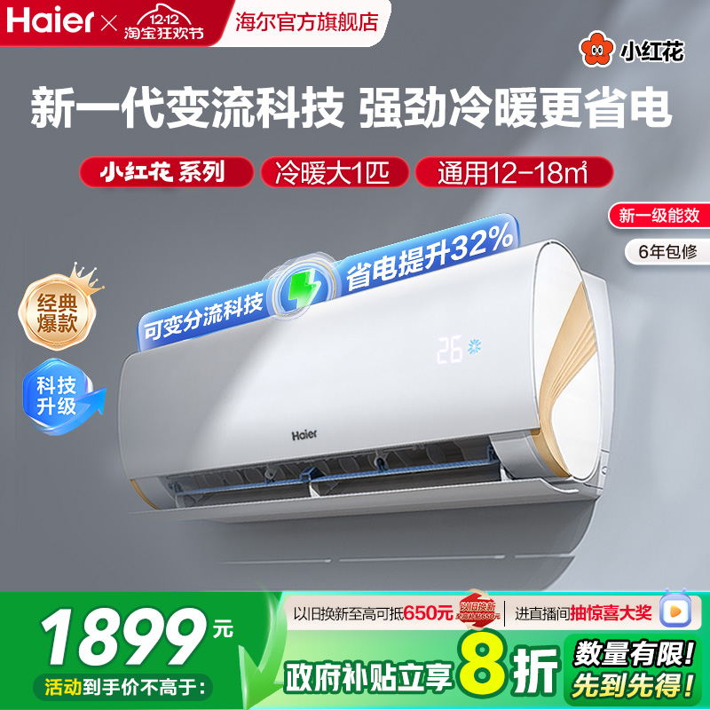 政府补贴20%海尔空调净省电1.5匹一级能效变频冷暖家用空调挂机
