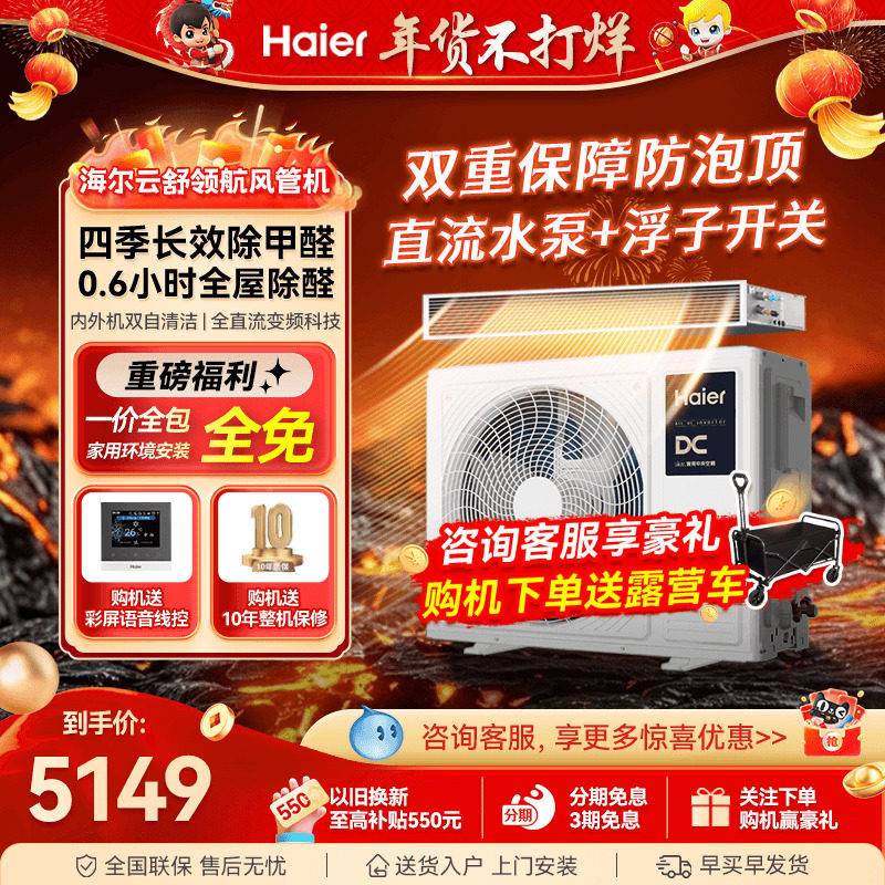 海尔中央空调风管机一拖一大1P/1.5匹/2P3匹变频冷暖家用一级能效