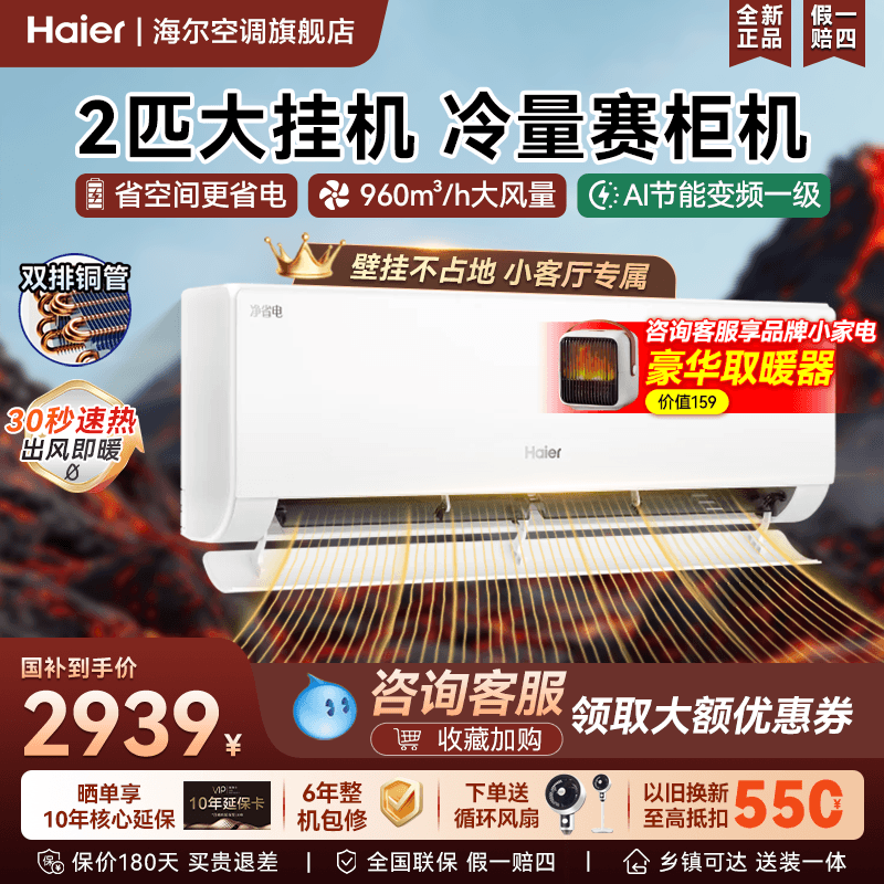 海尔空调2匹家用1.5匹3匹变频冷暖挂机卧室新一级能效官方旗舰店