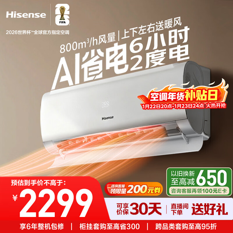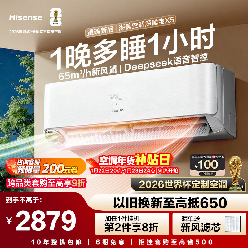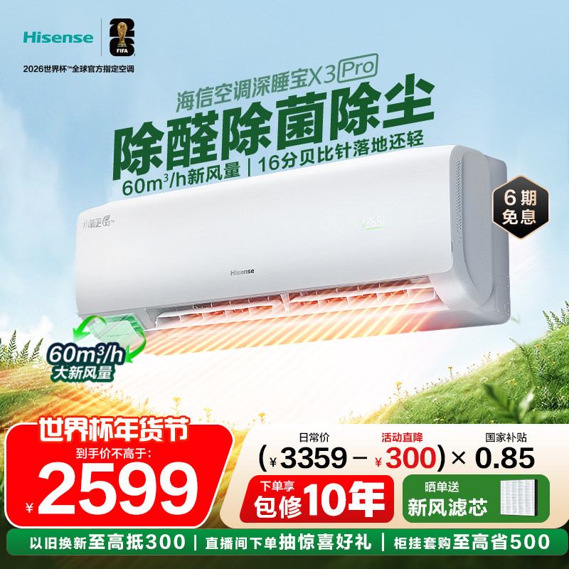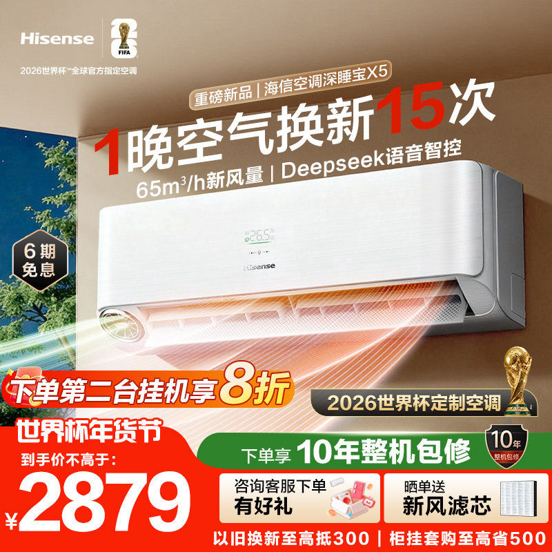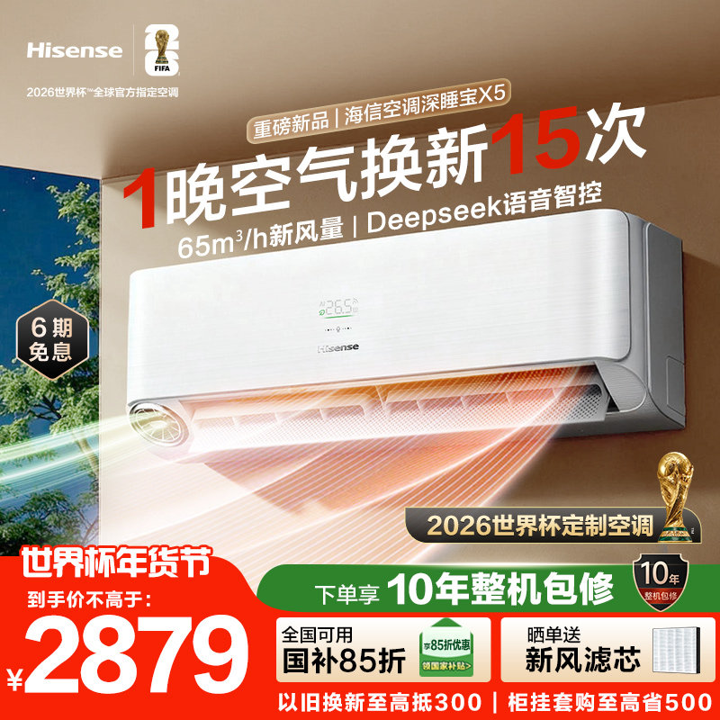 世界杯定制空调海信深睡宝X5新风大1.5匹一级能效变频卧室挂机