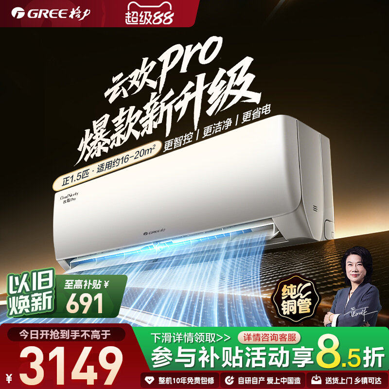 格力(GREE)空调套装 云佳Pro新款系列 新一级能效 省电 智能WIFI 内外机双自清洁 变频冷暖 挂机柜机组合套装 两室一厅【云佳Pro1.5匹*2+3匹】