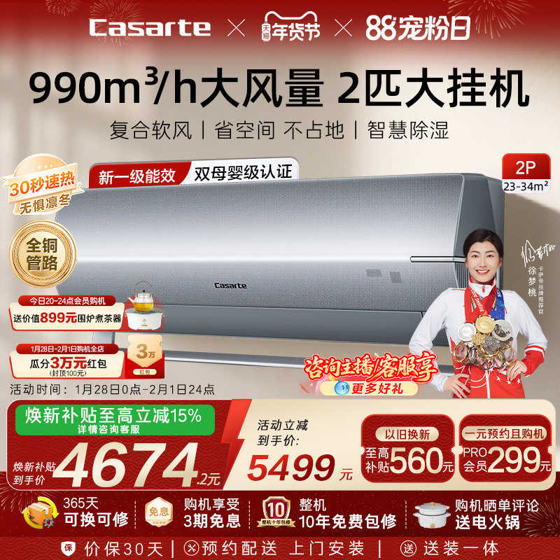换新补贴卡萨帝空调挂机变频家用卧室除湿冷暖省空间风量新1级2匹