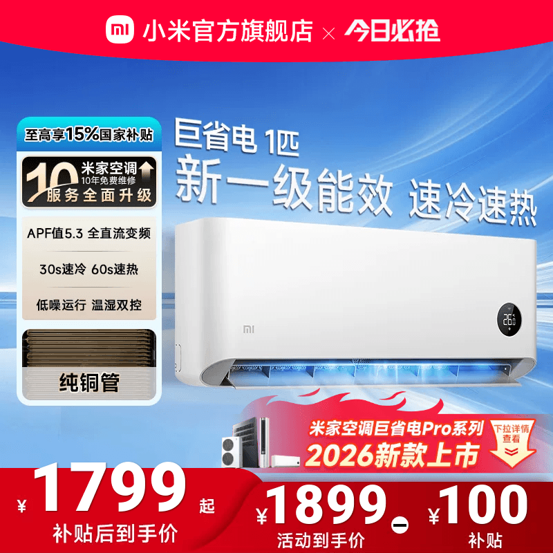 小米(MI)米家空调 巨省电Pro 大1.5匹 超一级能效 大双排冷凝器/蒸发器 以旧换新 高效压缩机 2026新款挂机 巨省电pro 大1.5匹 2026升级款