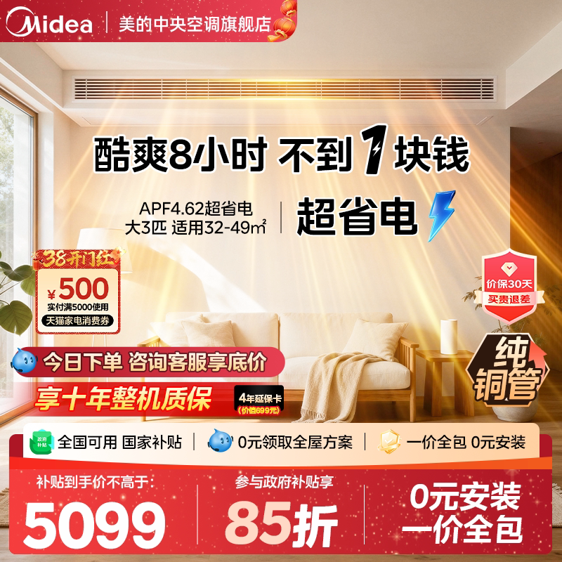 美的中央空调酷省电风管机家用一拖一客厅3匹一级能效变频风管式