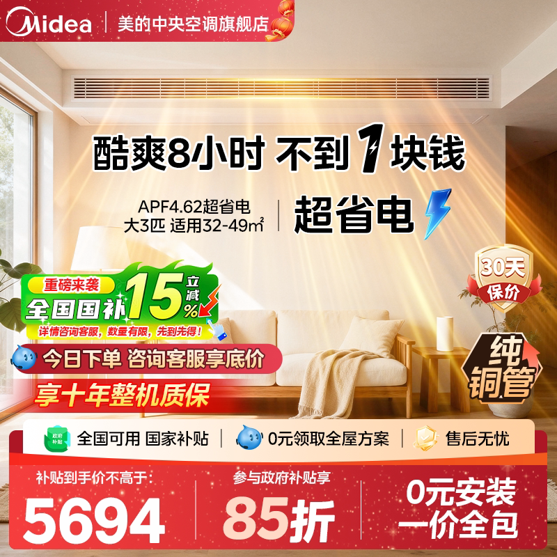 美的中央空调酷省电风管机大3匹家用一拖一客厅一级能效变频
