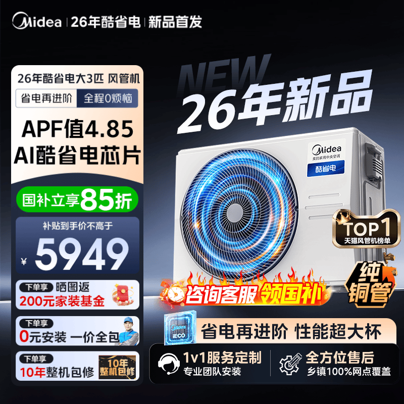 【2026款】美的中央空调酷省电26款风管机大3匹家用客餐厅一拖一