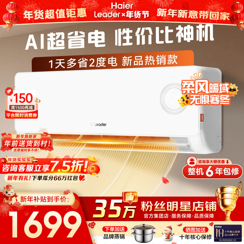 【纯铜管】海尔空调1.5匹1匹家用一级能效变频统帅冷暖挂机旗舰店