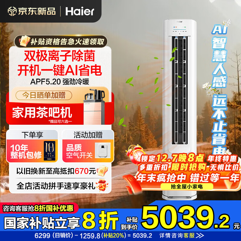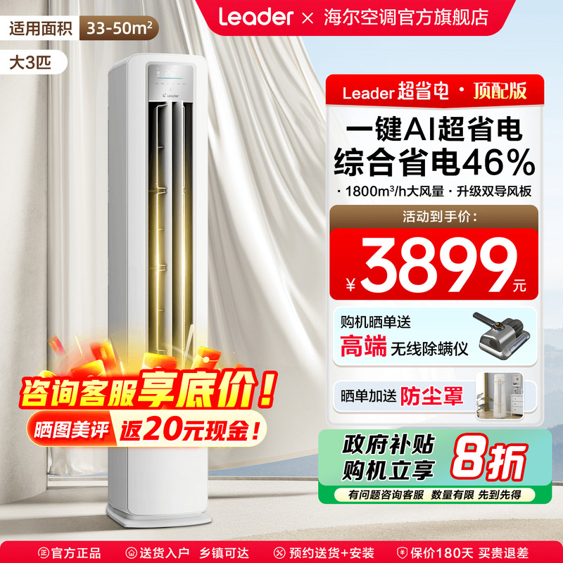 国补20%]海尔空调3匹2匹家用一级变频统帅立式客厅冷暖柜机旗舰店