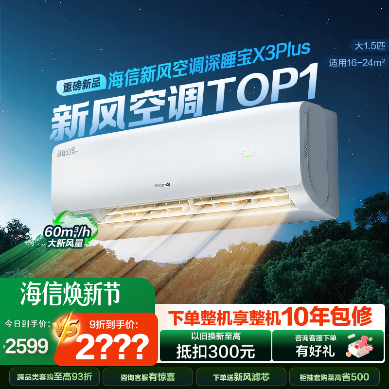 海信新风空调深睡宝X3Plus大1.5匹一级能效变频家用挂机