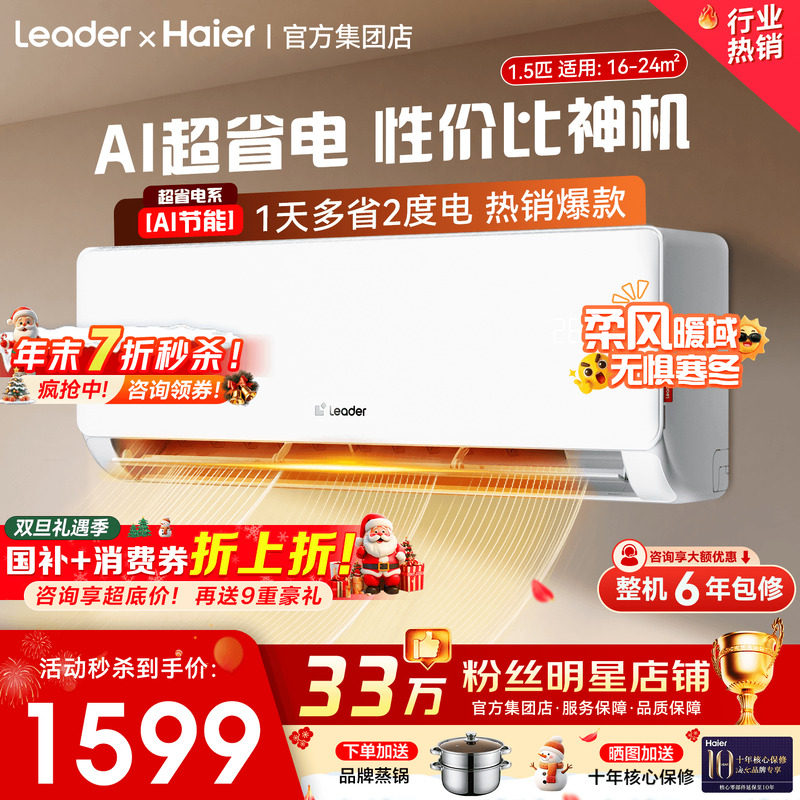 海尔空调家用1.5匹除甲醛LGA新一级变频冷暖挂机小红花净省电PLUS