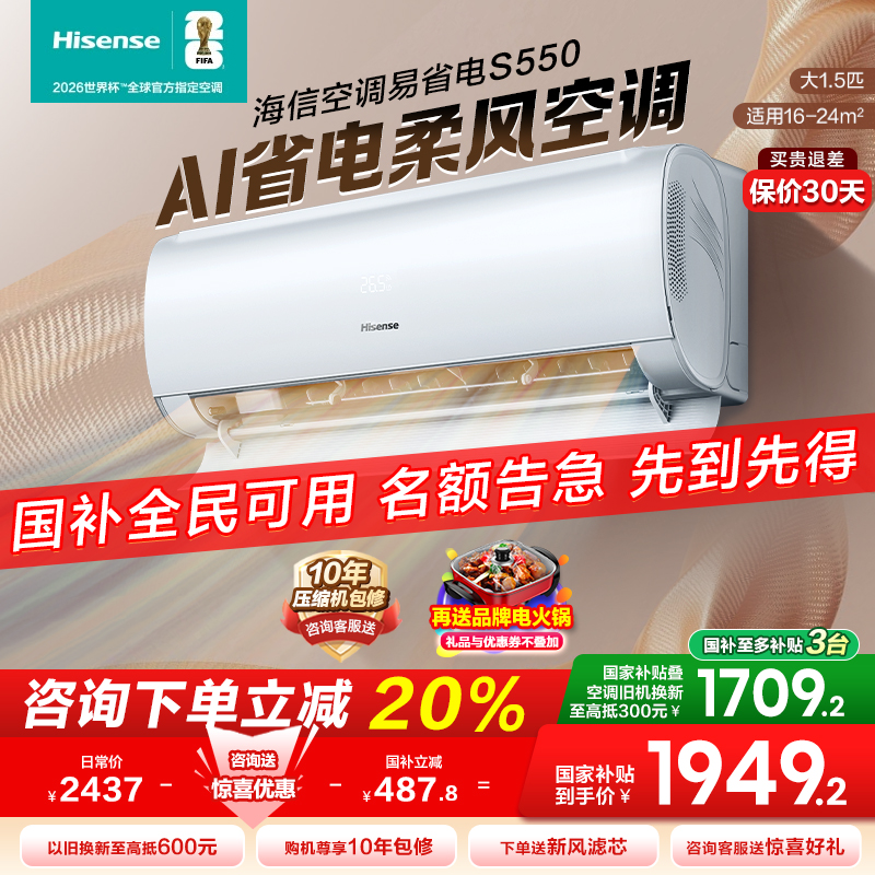 海信空调易省电轻享版大1.5匹挂机式新一级能效卧室以旧换新补贴