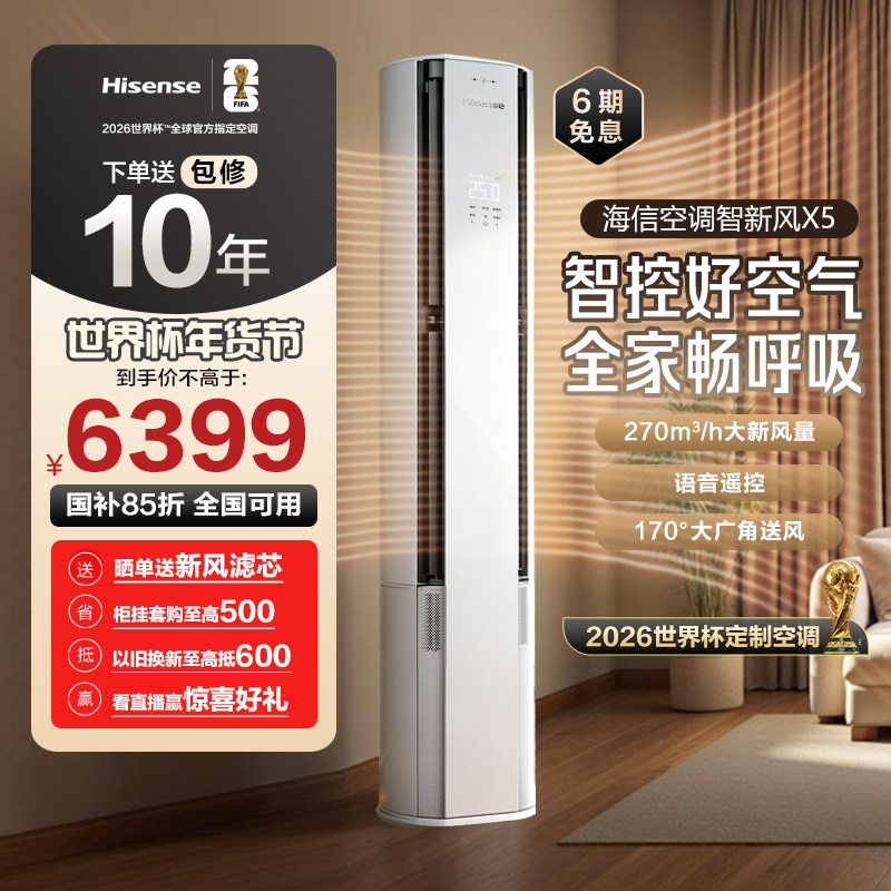 世界杯定制空调海信智新风X5新风大3匹家用立式一级能效客厅柜机