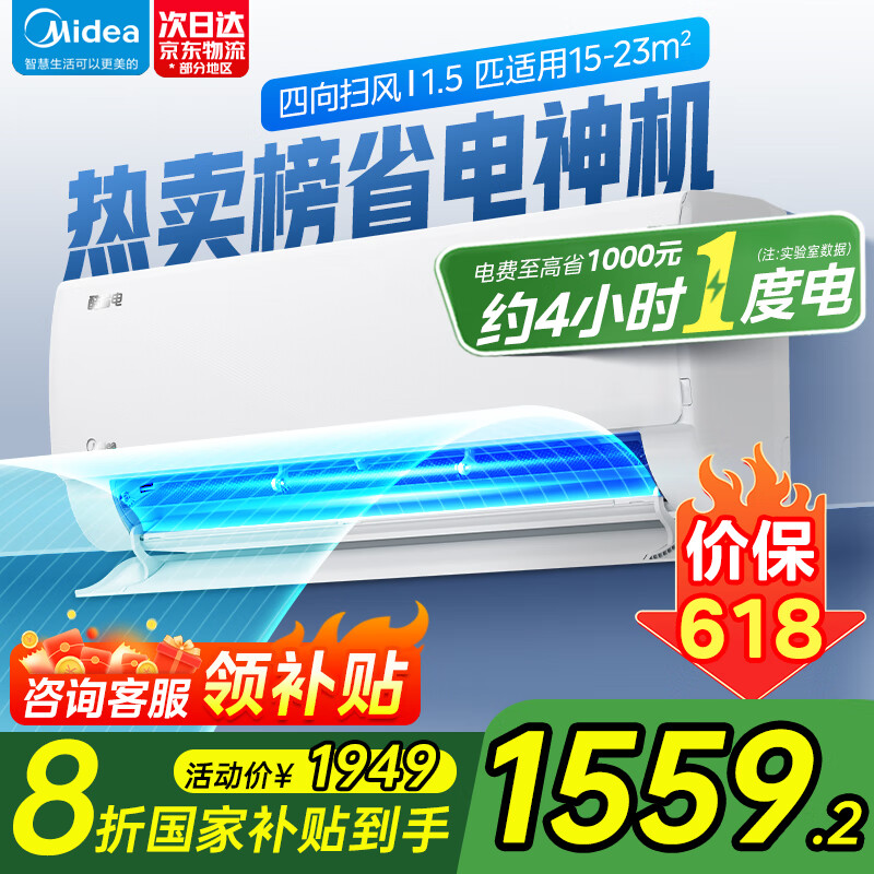 美的(Midea)空调2匹挂机 酷省电 新一级能效 卧室壁挂家用独立除湿节能省电智能家电以旧换新 大1.5匹 一级能效酷省电Ultra